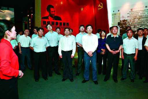 5月24日,在蘭考縣焦裕祿同志紀(jì)念館內(nèi),市委書記魏小東(前排右三)、市長范修芳(前排右四)等認(rèn)真聆聽講解員的講解。